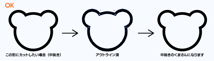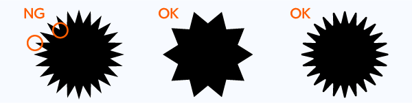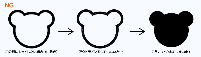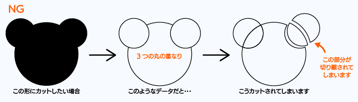 illustratorデータを入稿いただいた場合でも、上記のようなNGデザインだと、カットがうまくいかないため、そのまま使用することができません。特にオートトレースや線幅ツールを使用したときは要注意です。