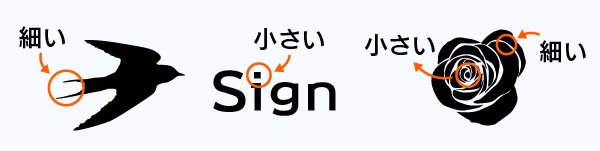 デザインの一部でも下記の4つにあてはまる箇所があれば、カットがうまくいかず、シートがくしゃくしゃになってしまったり、先端が立ち上がってしまったりしてしまいます。